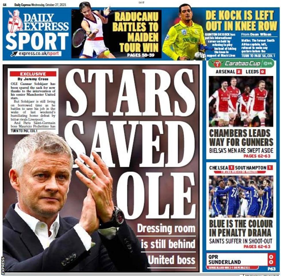 عنونت صحيفة إكسبريس بعنوان النجوم ينقذون أولي.. المدرب النرويجي لم يفقد السيطرة على غرف الملابس بعد.
