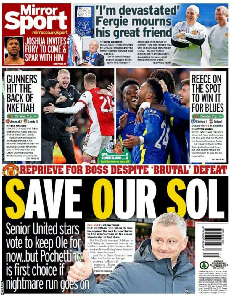 تصدر العنوان نجوم مانشستر يونايتد القدامى ينقذون أولي.. تصويت كبير للبقاء ووضع الثقة في المدرب للفترة المقبلة غلاف صحيفة ميرور الإنجليزية في إشارة بأن استمرار سولشاير هو القرار السائد.