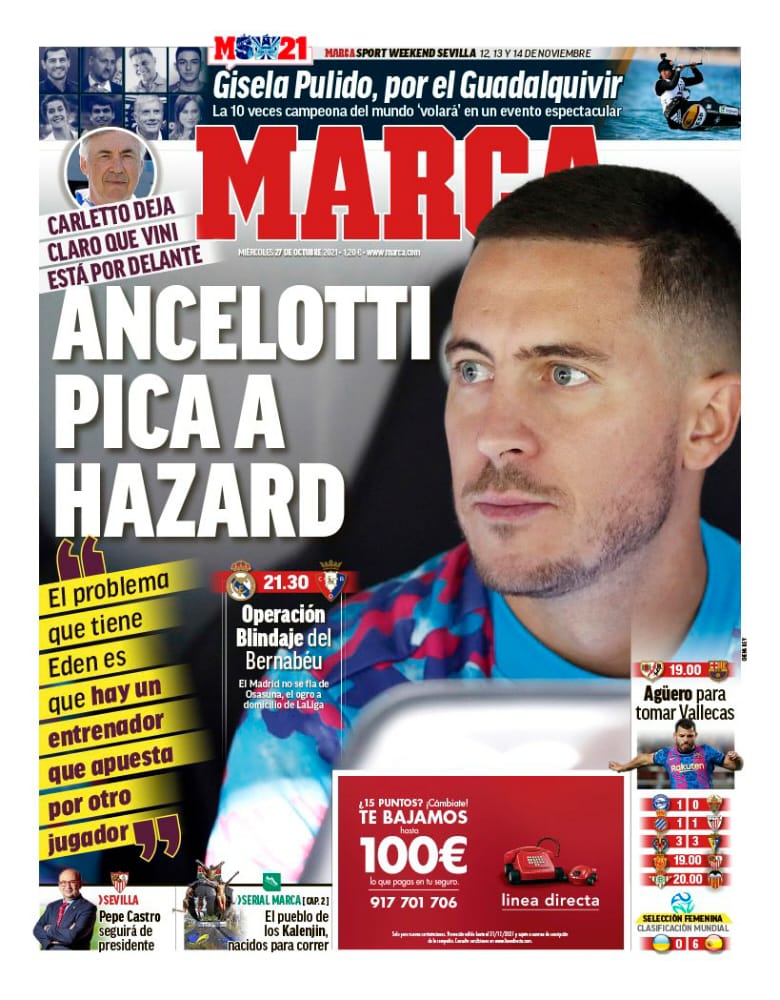 عنونت صحيفة ماركا الإسبانية بـ أنشيلوتي يحذر هازارد...كارلو أوضح أن فينيسيوس هو المستقبل، مشكلة إيدن هي أن هناك مدربًا يراهن على لاعب آخر، وذلك بعد تألق كبير من النجم البرازيلي الشاب في المباريات الأخيرة.