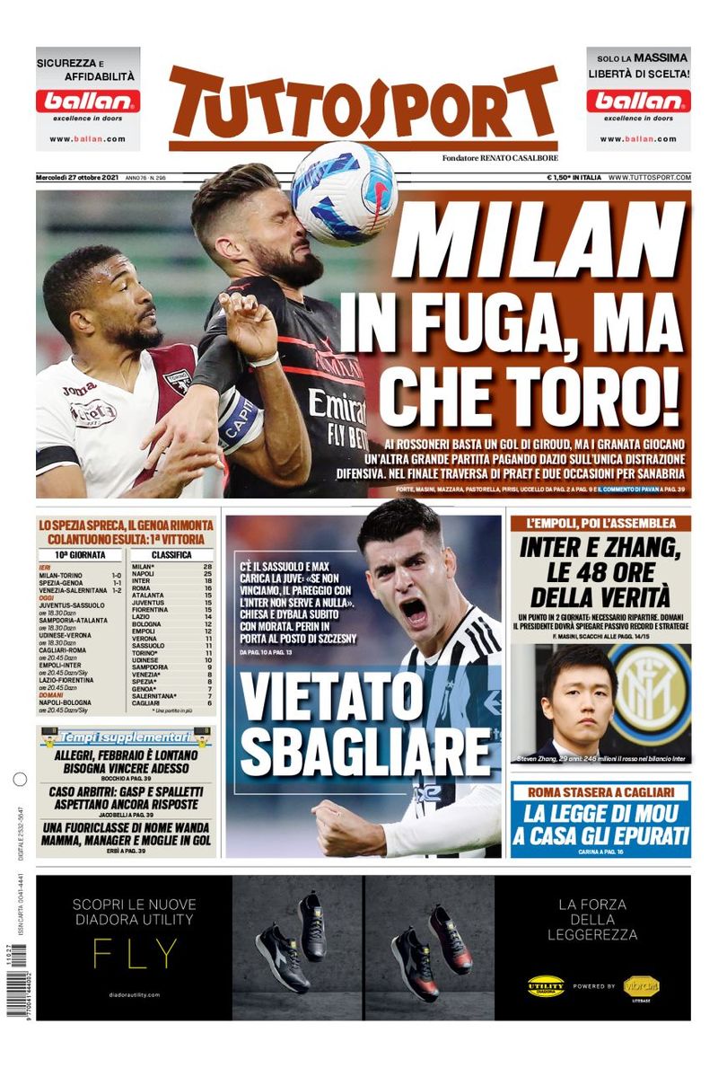 سلطت صحيفة توتو سبورت الإيطالية الضوء على فوز ميلان، بالعنوان ميلان يهرب، لكن يا له من تورو.. هدف جيرو كافٍ للروسونيري، لكن الغراناتا قدم أداءً رائعا آخر، دفع ثمن الهفوة الدفاعية الوحيدة، وذلك بعد تصدر ميلان الدوري الإيطالي عقب فوز الأمس.