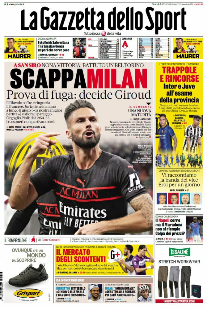 عنونت صحيفة لا جازيتا ديللو سبورت الإيطالية بعنوانن ميلان يهرب.. إثبات الهروب: جيرو حاسم، في صفحة غلافها، بعد أن حسم جيرو الفوز ال 9 لفريق ميلان في الدوري المثير ولعبة الكراسي الموسيقية بمراكز القمة مع نابولي وإنتر.
