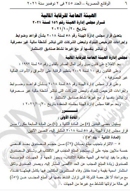 نشرت جريدة الوقائع المصرية، قرار مجلس إدارة الهيئة رقم 48 لسنة 2018 بشأن قواعد وضوابط وإجراءات الترخيص للبنوك ولبعض الشركات التي تباشر أنشطة مالية غير مصرفية، بأن تباشر بنفسها أو مع غيرها نشاط صناديق الاستثمار.