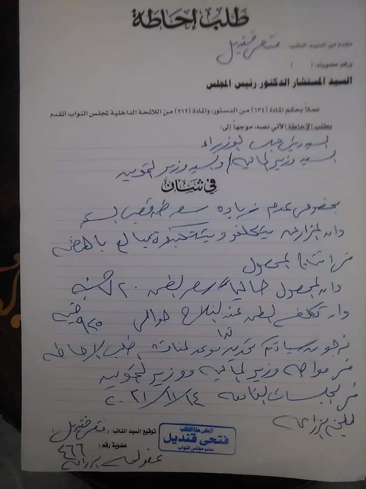 وناشد عضو مجلس النواب رئيس المجلس تحديد موعد لمناقشة طلب الإحاطة الموجه إلى وزير المالية ووزير التموين في الجلسة المقبلة، والمقرر عقدها في يوم 14 من شهر نوفمبر الحالي.
