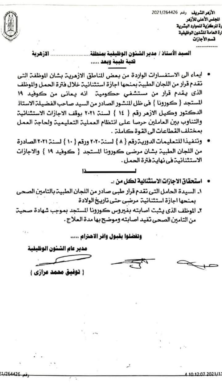وأصدر المجلس منشورا حصل عليه القاهرة 24، نص على أنه: بناء على الاستفسارات الواردة من بعض المناطق الازهرية بشان الموظفة التي تقدم قرار من اللجان الطبية بمنحها إجازة استثنائية خلال فترة الحمل والموظف الذي يقدم قرار من مستشفى حكومية أنه يعاني من كوفید 19 المستجد، في ظل المنشور الصادر من الدكتور وكيل الأزهر، رقم {14} لسنة 2021، بوقف الاجازات الاستثنائية والتناوب بين العاملين حرصا على انتظام العملية التعليمية ولحاجة العمل بمختلف القطاعات إلى القوة كاملة.