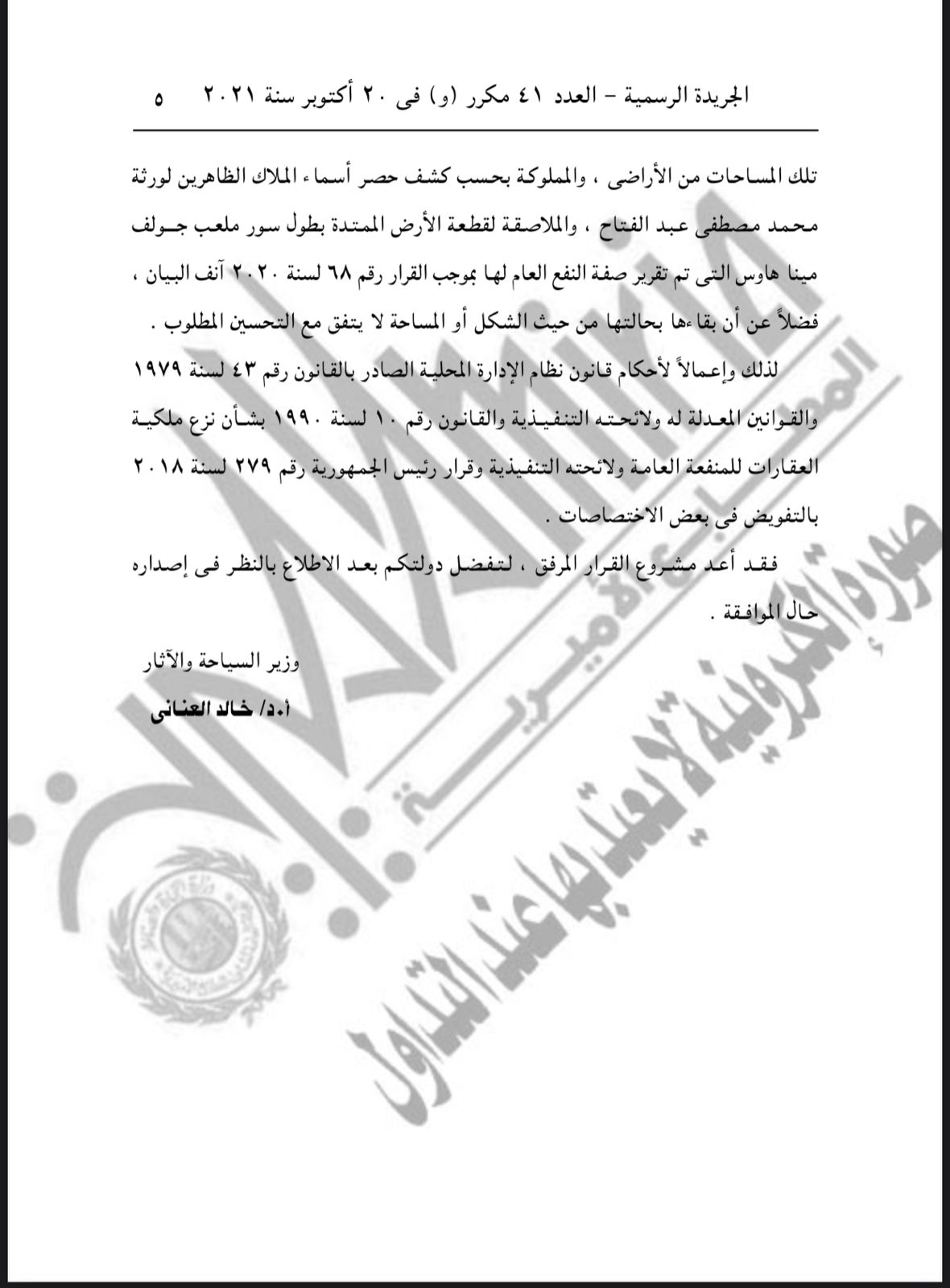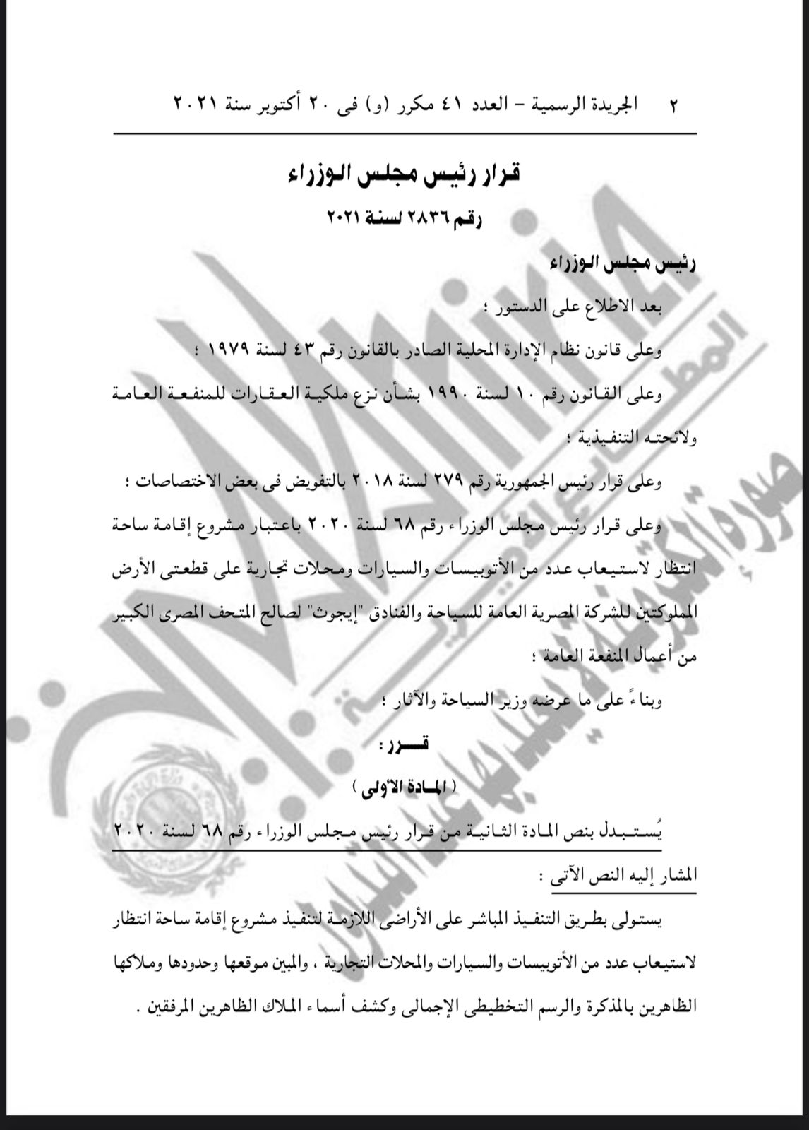 يُستولى بطريق التنفيذ المباشر على الأراضي اللازمة لتنفيذ مشروع إقامة ساحة انتظار لاستيعاب عدد من الأتوبيسات والسيارات والمحلات التجارية لخدمة زائري المتحف المصري الكبير وغيرهم.
