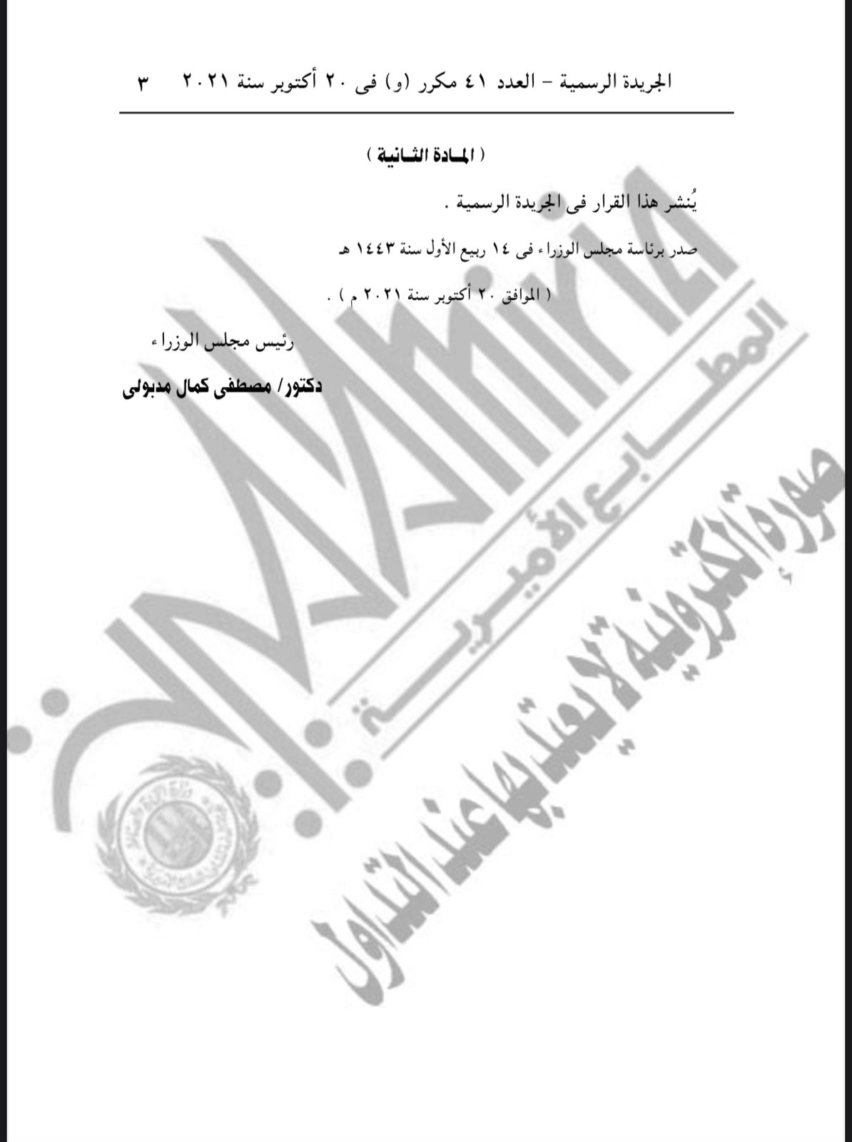 نشرت الجريدة الرسمية، في عددها الصادر اليوم الخميس، قرار الدكتور مصطفى مدبولي رئيس مجلس الوزراء، رقم 2836 لسنة 2021.