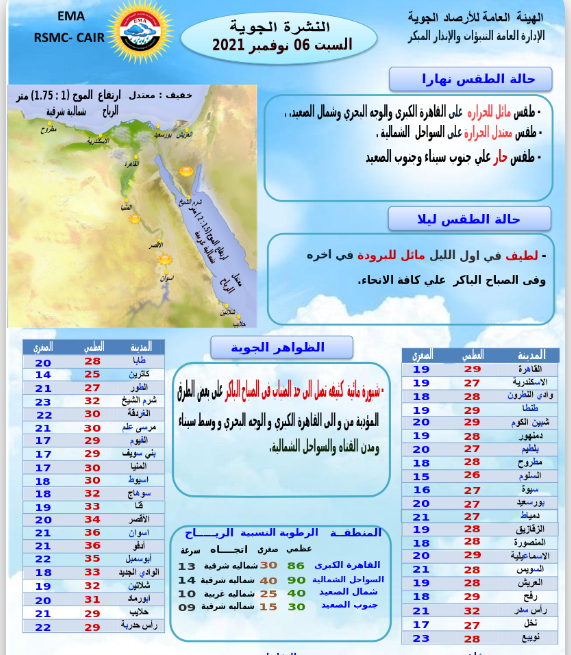 أصدرت الهيئة العامة للأرصاد المصرية نشرتها الجوية التي أعلنت من خلالها تفاصيل حالة الجو غدا السبت الموافق 6 نوفمبر، ودرجات الحرارة والظواهر الجوية وتفاصيل حركة الرياح ونسب الرطوبة على كافة أنحاء البلاد.