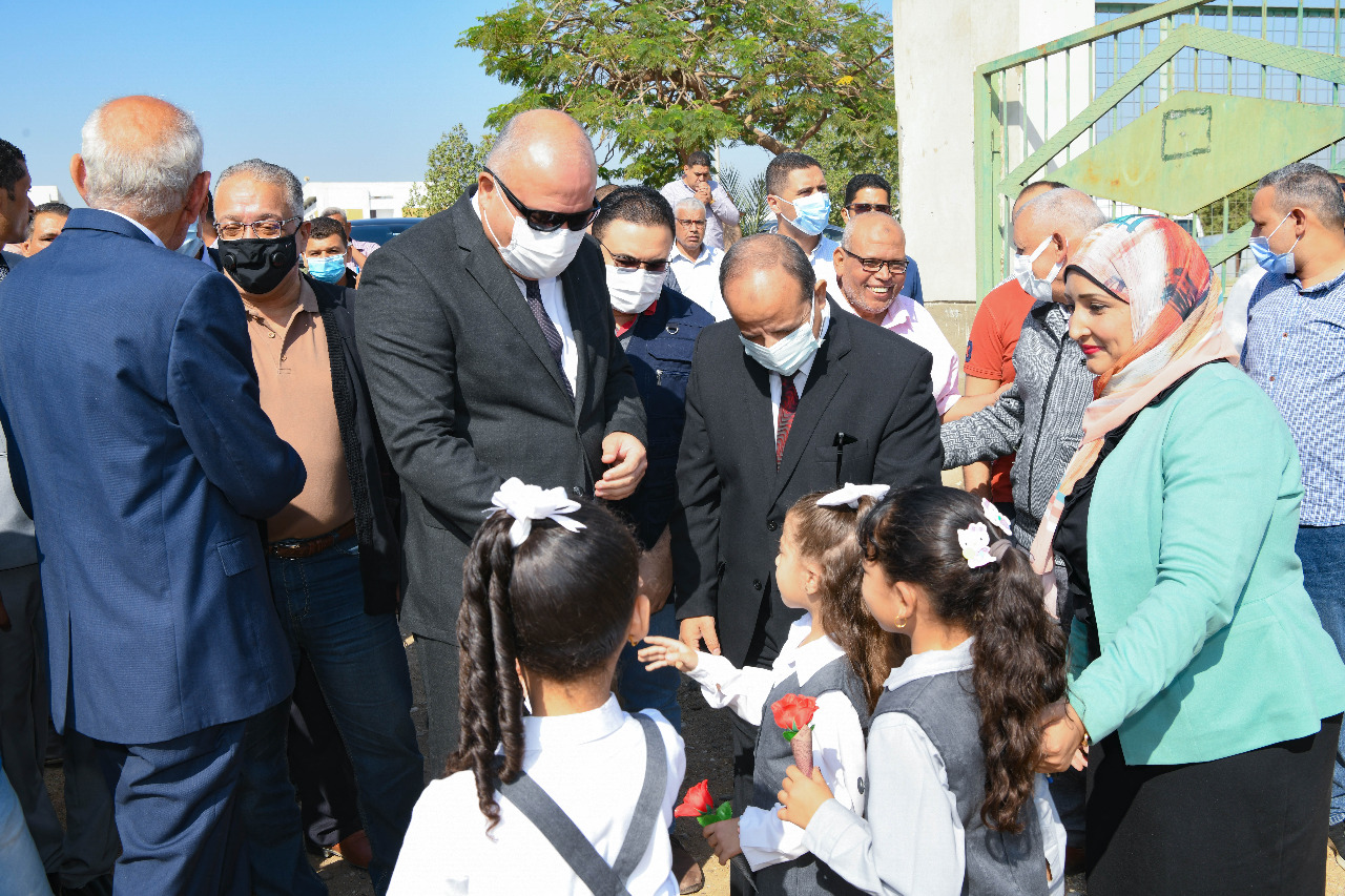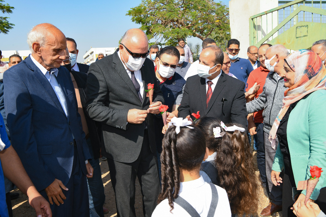 تلاميذ مدرسة اللغات الابتدائية بالألومنيوم يستقبلون محافظ قنا بالورد والشوكولاتة