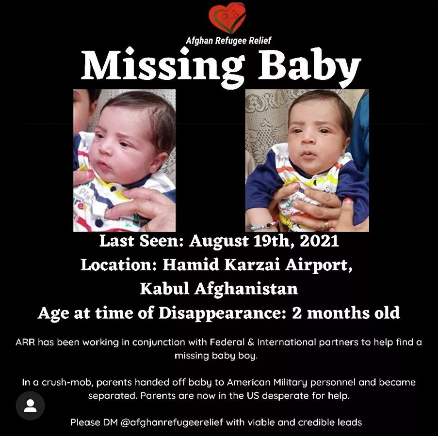 وقال مسؤول حكومي أمريكي، مطلع على الوضع، إن الطفل شوهد لآخر مرة وهو يُسلم إلى جندي أمريكي خلال الفوضى في مطار كابول، لكن للأسف لا أحد يستطيع العثور على الطفل، منذ أن تم تسليمه في 20 أغسطس الماضي.
