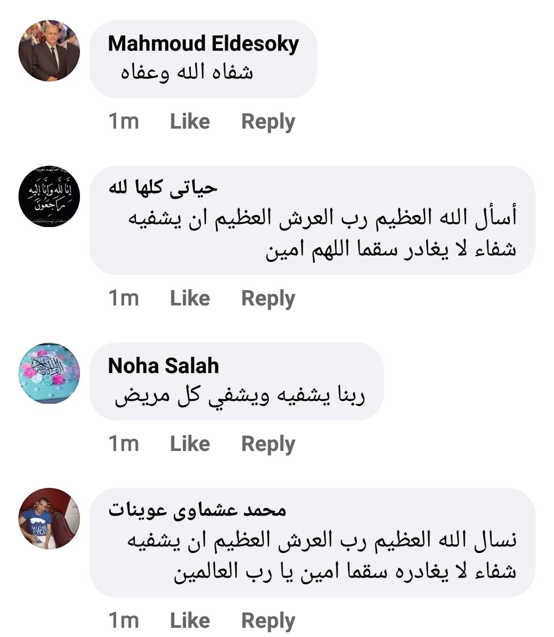 وعلق آخر: أسأل الله العظيم رب العرش الكريم أن يشفيك ويعافيك ويشفي كل مريض يتألم ولا يتكلم، إلى جانب سميرة محمد التي علقت: ربنا يشفى الجميع يا رب العالمين.