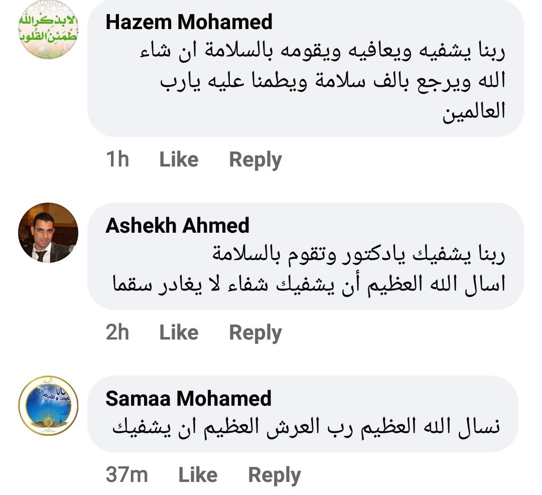 بينما قال حساب آخر: شفاه الله وعافاه أمين يا رب، إلى جانب أم علي التي كتبت: نسأل الله العظيم رب العرش العظيم أن يشفيه ويعافيه يا رب شفاء لا يغادر سقما عاجلا غير آجل يا رب هو وكل مريض يا رب العالمين.