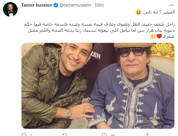 ونشر تامر حسين صورة تجمعهما عبر حسابه الخاص على موقع التواصل الاجتماعي تويتر، وعلق عليها قائلًا: القيصر إيه تاني؟..راجل مثقف، حفيف الظل، وعفوي، وعارف قيمة نفسه.