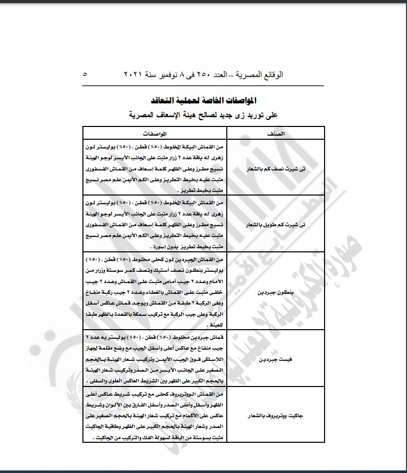 ننشر المواصفات الخاصة بالزي الرسمي الجديد لمقدمي الخدمة الإسعافية بهيئة الإسعاف المصرية، كما وردت في نموذج التعاقد على توريد زي جديد لصالح الهيئة.