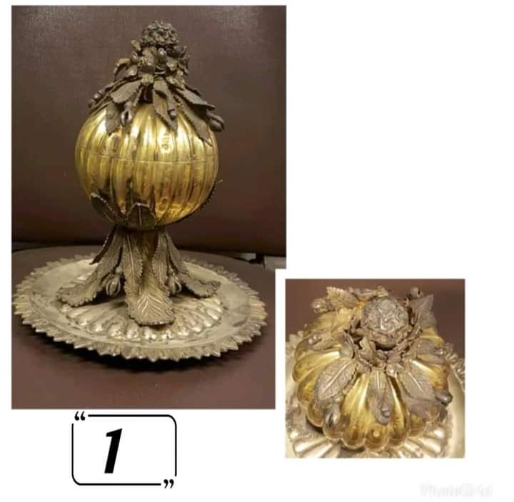 - مبخرة من الفضة المذهبة على شكل ثمرة محلاة بتضليعات بارزة، ترتكز على قاعدة من أفرع نباتية ولها غطاء ذو مقبض على شكل أوراق شجر.