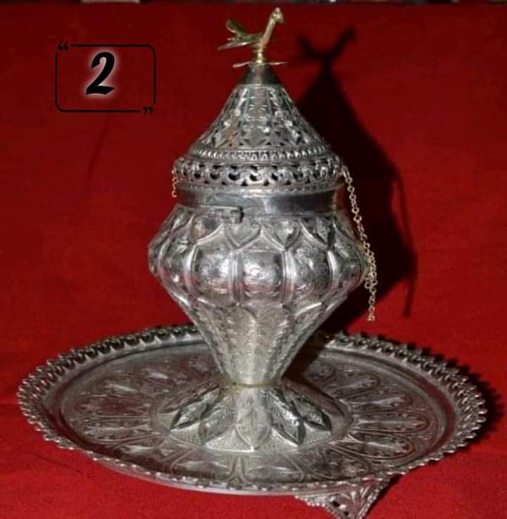 - مبخرة من الفضة على شكل زهرة اللوتس محلاة بتضليعات طويلة، وترتكز على قاعدة تأخذ شكل الصينية وللمبخرة غطاء مفرغ، ينتهى بمقبض على شكل طائر.
