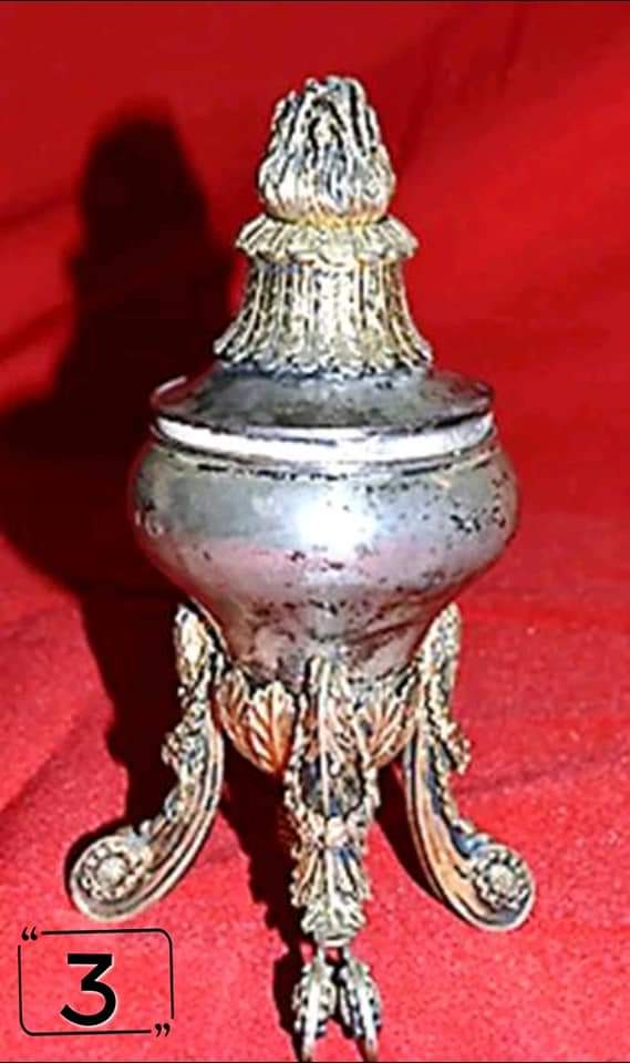 - مبخرة من الفضة ترتكز، على 3 أرجل مذهبه مزينة بزخارف نباتية يعلوها بدن أملس خالي من الزخارف، وللمبخرة غطاء ذو مقبض يشبه الشعلة.