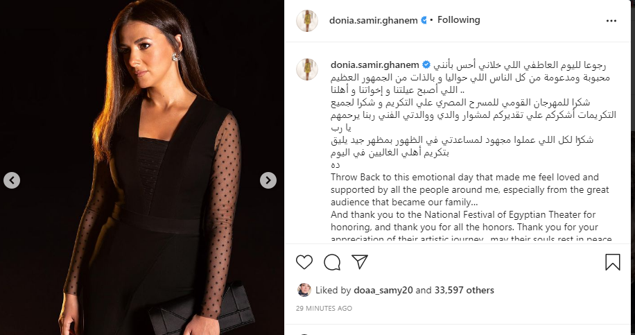 ونشرت دنيا سمير غانم الصور، عبر حسابها الشخصي عبر موقع تبادل الصور والفيديوهات القصيرة انستجرام، وعلقت عليها قائلة: رجوعًا لليوم العاطفي، اللي خلاني أحس بأنني محبوبة ومدعومة من كل الناس اللي نحوا، وبالذات من الجمهور العظيم، اللي أصبح عيلتنا وإخواتنا وأهلنا.