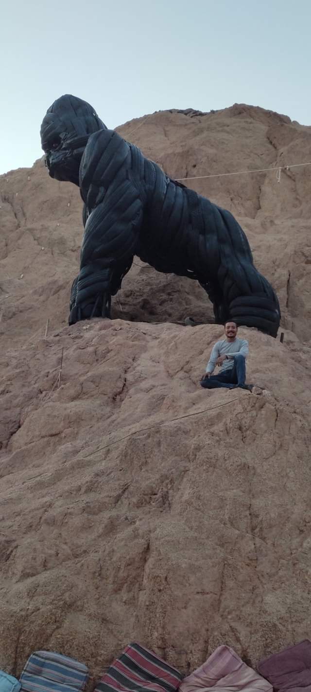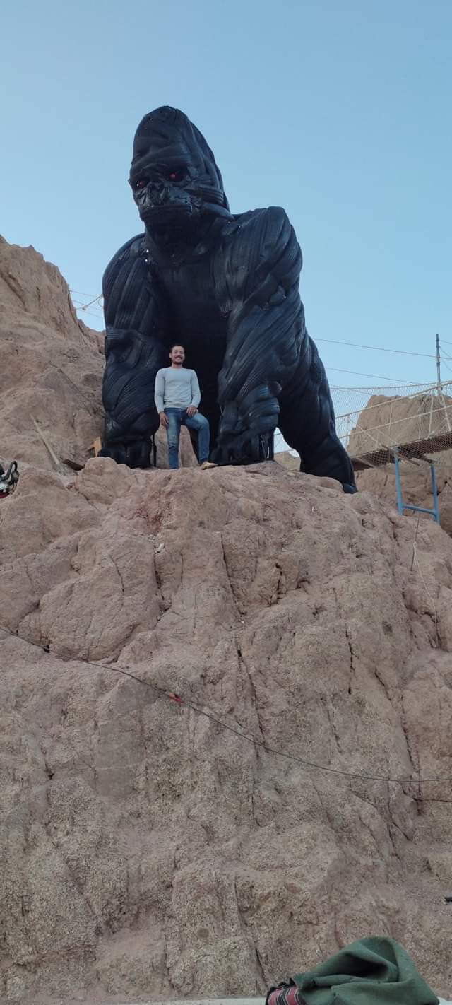 بـ 250 فردة كاوتش.. فنان الخردة يصنع مجسم "كينج كونج" على جبل بسيناء