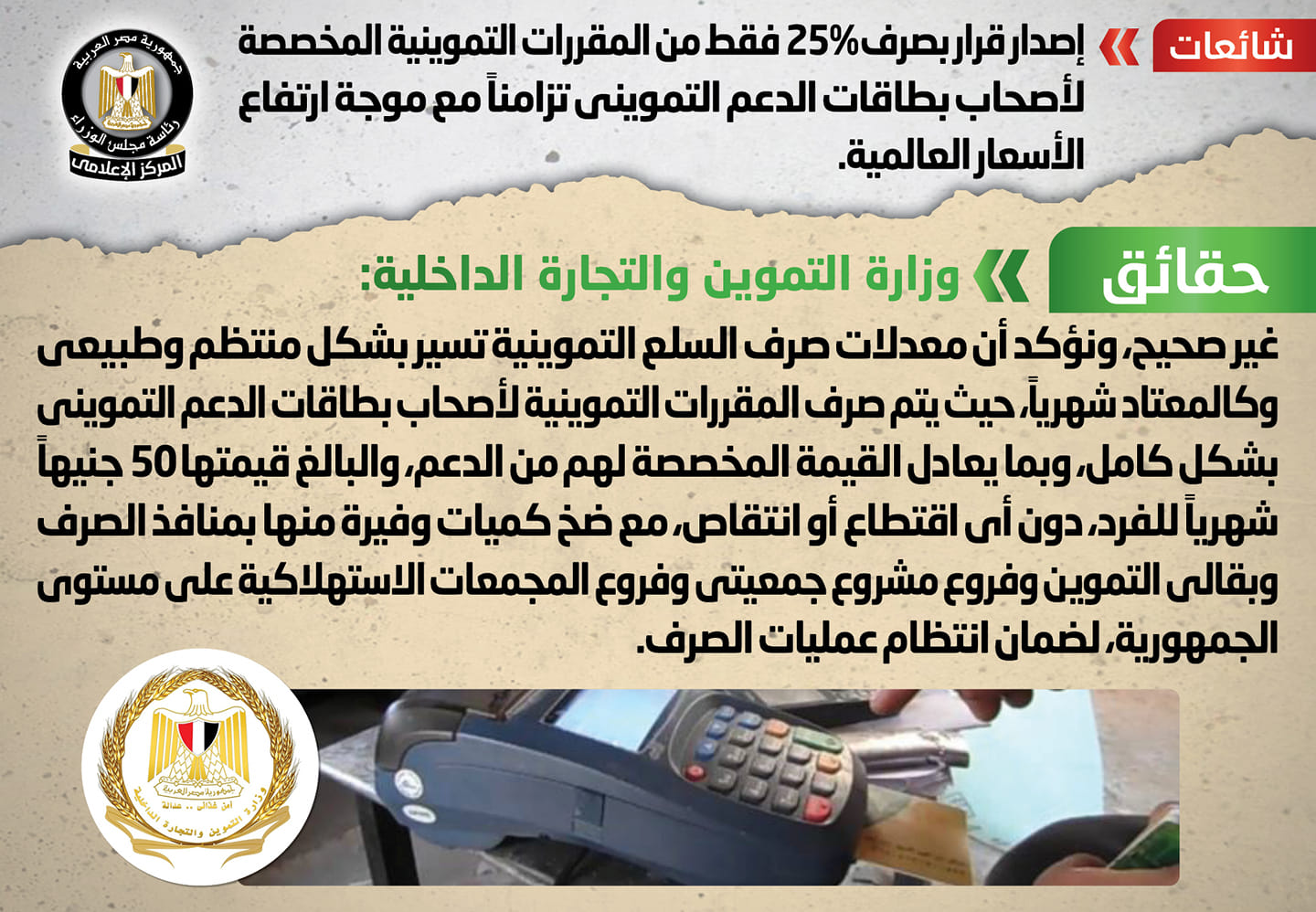 تداولت بعض المواقع الإلكترونية وصفحات التواصل الاجتماعي أنباء بشأن إصدار قرار بصرف 25% فقط من المقررات التموينية المخصصة لأصحاب بطاقات الدعم التمويني تزامنًا مع موجة ارتفاع الأسعار العالمية.