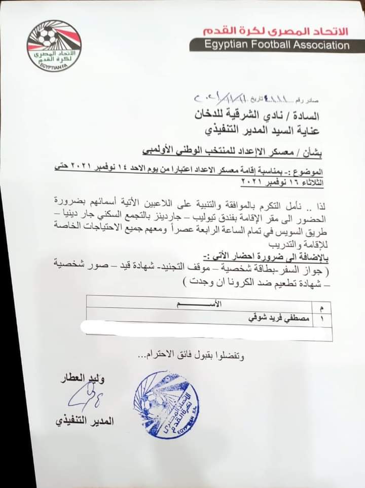 استدعى شوقي غريب المدير الفني لمنتخب مصر الأولمبي، مصطفى فريد شوقي، لاعب الفريق الكروي الأول بنادي إيسترن كومباني.