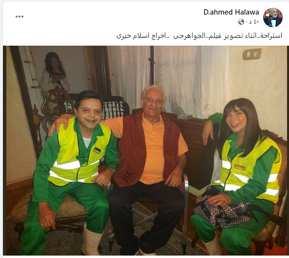 ونشر أحمد حلاوة صورة تجمعه بمنى زكي وهنيدي، وظهرا مرتديين ملابس رجال الإسعاف، وذلك عبر حسابه الشخصي على فيسبوك، معلقًا: استراحة خلال تصوير فيلم الجواهرجي، إخراج إسلام خيري.