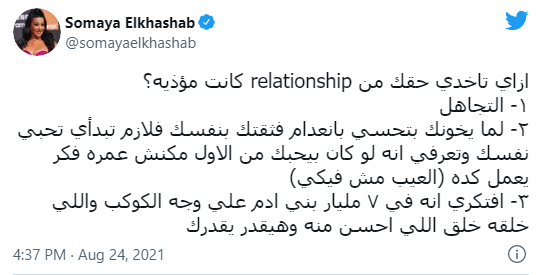 ووجهت سمية الخشاب عدة نصائح للفتيات، ترشدهن فيها إلى كيفية حصولها على حقوقها، عند انتهاء علاقة مؤذية مرت بها، قائلة: إزاي تاخدي حقك من علاقة كانت مؤذية؟