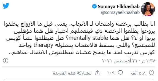 كما طالبت سمية الخشاب بخضوع الزوجين لبعض الفحوصات قبل زواجهما، حتى يتم التعرف على الزيجة ومدى تأهيلها للإنجاب أم لا، قائلة: أنا باطالب برخصة وامتحان لـ الإنجاب، يعني قبل ما الأزواج يخلفوا يروحوا يطلعوا الرخصة دي، فا يتعملهم اختبار.. هل هما مؤهلين يربوا أو لأ؟ هل هما مؤهلين عقليا؟، هل هيطلعوا نشأة كويسة للمجتمع؟