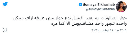 كما أعربت سمية الخشاب عن استيائها من زواج الصالونات، لافتة إلى أنه زواج فاضل بوجهة نظرها، وغالبًا لا يحقق نجاحًا أسريا، بسبب قلة التواصل بين الشخصين، وعدم معرفة كل منهما الآخر، قائلة: جواز الصالونات ده يعتبر أفشل نوع جواز، مش عارفة إزاي ممكن واحدة تتجوز واحد مشافتهوش إلا كذا مرة.