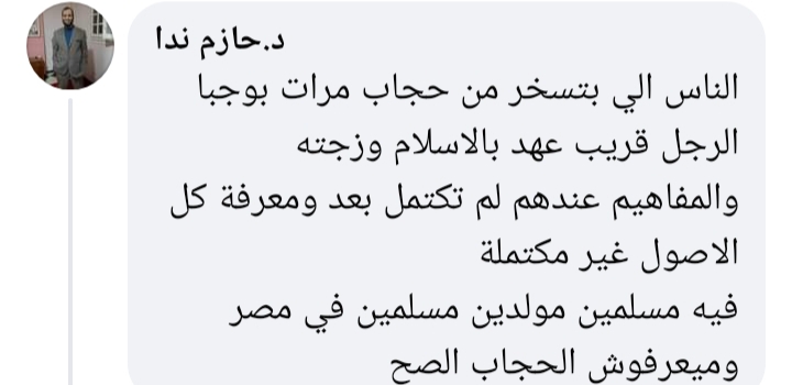 في حين قال حساب باسم حازم ندا: الناس اللي بتسخر من حجاب مرات بوجبا، الرجل قريب عهد بالإسلام وزوجته، والمفاهيم عندهم لم تكتمل بعد، ومعرفة كل الأصول غير مكتملة، في مسلمين مولودين مسلمين في مصر ومايعرفوش الحجاب الصح.