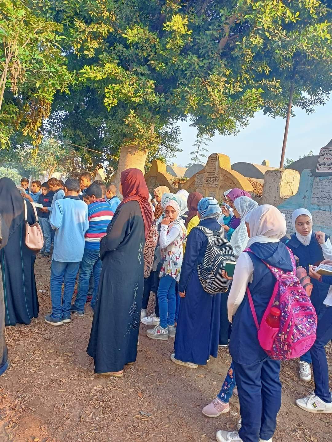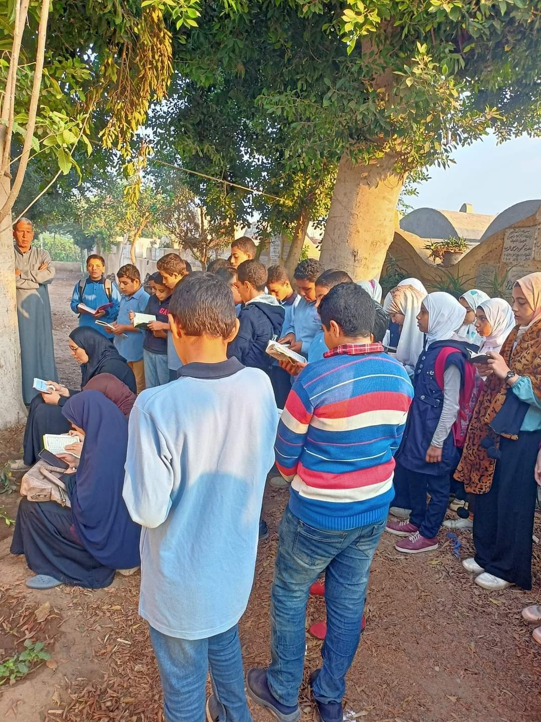في طوخ.. طلاب مدرسة يذهبون للمقابر لقراءة القرءان على قبر معلمتهم | صور