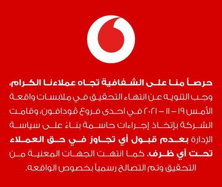 في أول رد رسمي من شركة فودافون حول واقعة الفيديو المنتشر على فيسبوك، الذي يظهر اعتداء موظفي أحد أفرع الشركة، على أحد العملاء قالت الشركة في بيان رسمي لها: حرصا منا على الشفافية تجاه عملاءنا الكرام وجب التنويه عن انتهاء التحقيق في ملابسات واقعة الأمس 19 نوفمبر 2021 في إحدى فروع فودافون.