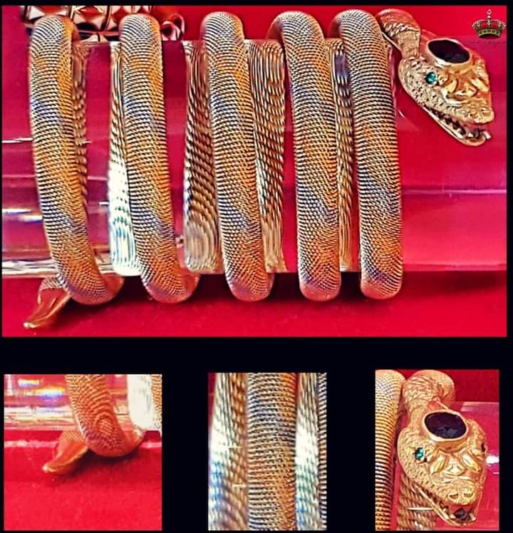 وقالت إدارة المتحف عبر منشورها، إن هناك قطعة أسورة على شكل ثعبان وتعتبر من أهم ️مقتنيات الملكة فريدة وهي أسورة من الذهب على شكل ثعبان يفتح فمه مصمم على شكل سوستة، وعينان الثعبان مصنوعتان من حجر الزمرد الأخضر، والرأس يتوسطها فص كبير من الزفير الأزرق، وذيل الثعبان مدبب ومن الذهب.