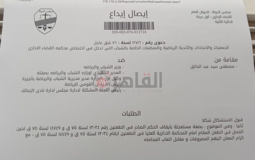 وأضاف عبد الخالق: تم قبول الاستشكال من خلال إيصال الإيداع الذي حمل رقم دعوى رقم 12716 لسنة 76ش ق عاجل، الخاص بالجمعيات والاتحادات والأندية الرياضية والمنظمات الخاصة للشباب والتي تدخل في اختصاص محكمة القضاء الإداري.