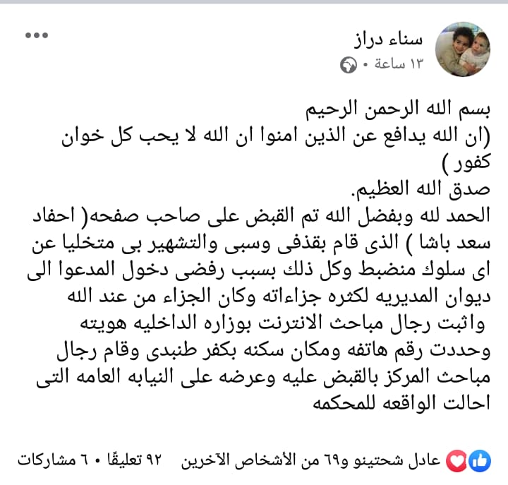 وكشفت سناء دراز مدير الشئون التنفيذية بمديرية التربية والتعليم بمحافظة المنوفية، أنها فوجئت بصفحة مجهولة على فيسبوك، باسم أحفاد سعد باشا تتناول مغالطات وانتقادات تخصها، جميعها خارج إطار العمل، وتمادت لدرجة الخوض في الأعراض والتهكم على الملبس والشكل، والإساءة لزوجها وأبنائها، مؤكدة على تحرير محضرا في القاهرة والتي بدورها تمكنت من ضبط المتهم من خلال رقم هاتفه.