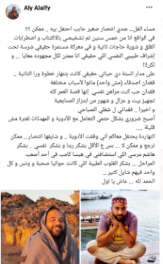 وكتب علي الألفي منشورًا، عبر صفحته الشخصية بموقع التواصل الاجتماعي فيس بوك، قائلًا: مساء الفل.. عندي انتصار صغير حابب احتفل بيه.. ممكن ؟؟، في الواقع أنا من خمس سنين تم تشخيصي بالاكتئاب، واضطرابات القلق، وشوية حاجات تانية، وفي معركة مستمرة حقيقي شرسة، تحت إشراف طبيبي النفسي اللي حقيقي أنا ممتن لكل مجهوده معايا.