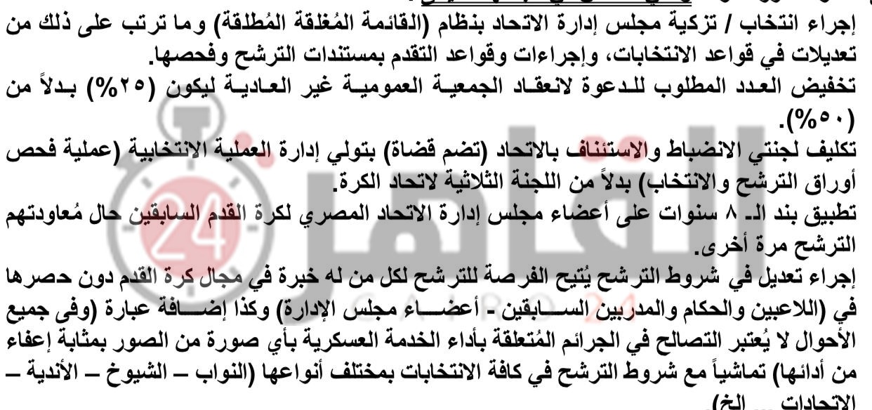 وتعقد انتخابات اتحاد الكرة بنظام القائمة المغلقة بجانب، تحفيض العدد المطلوب لانعقاد الجمعية العمومية غير العادية ليكون 25% بدلًا من 50%.