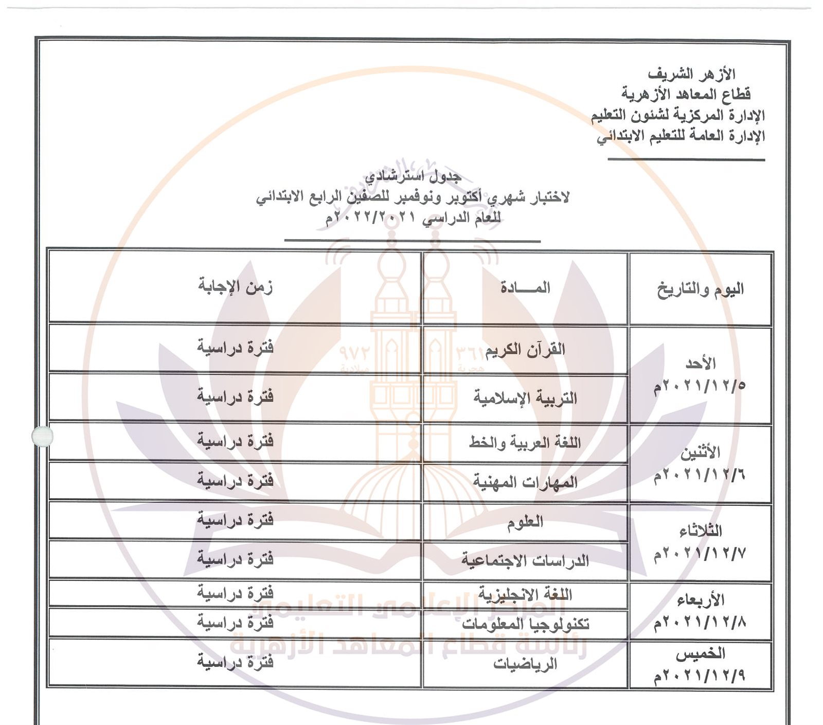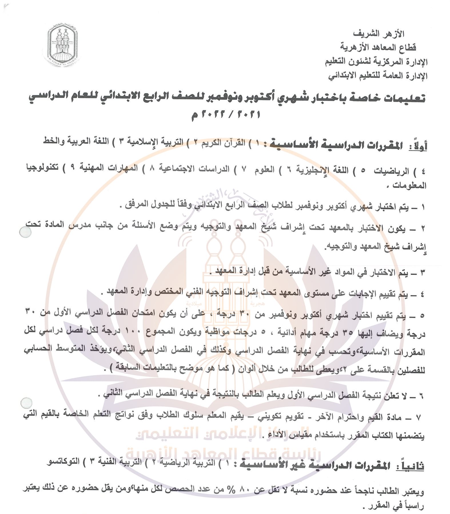 أصدر قطاع المعاهد الأزهرية، برئاسة الدكتور سلامة جمعة داود رئيس قطاع المعاهد الأزهرية، تعليمات خاصة باختبار شهري أكتوبر ونوفمبر للصف الرابع الابتدائي للعام الدراسي 2021 /2022.