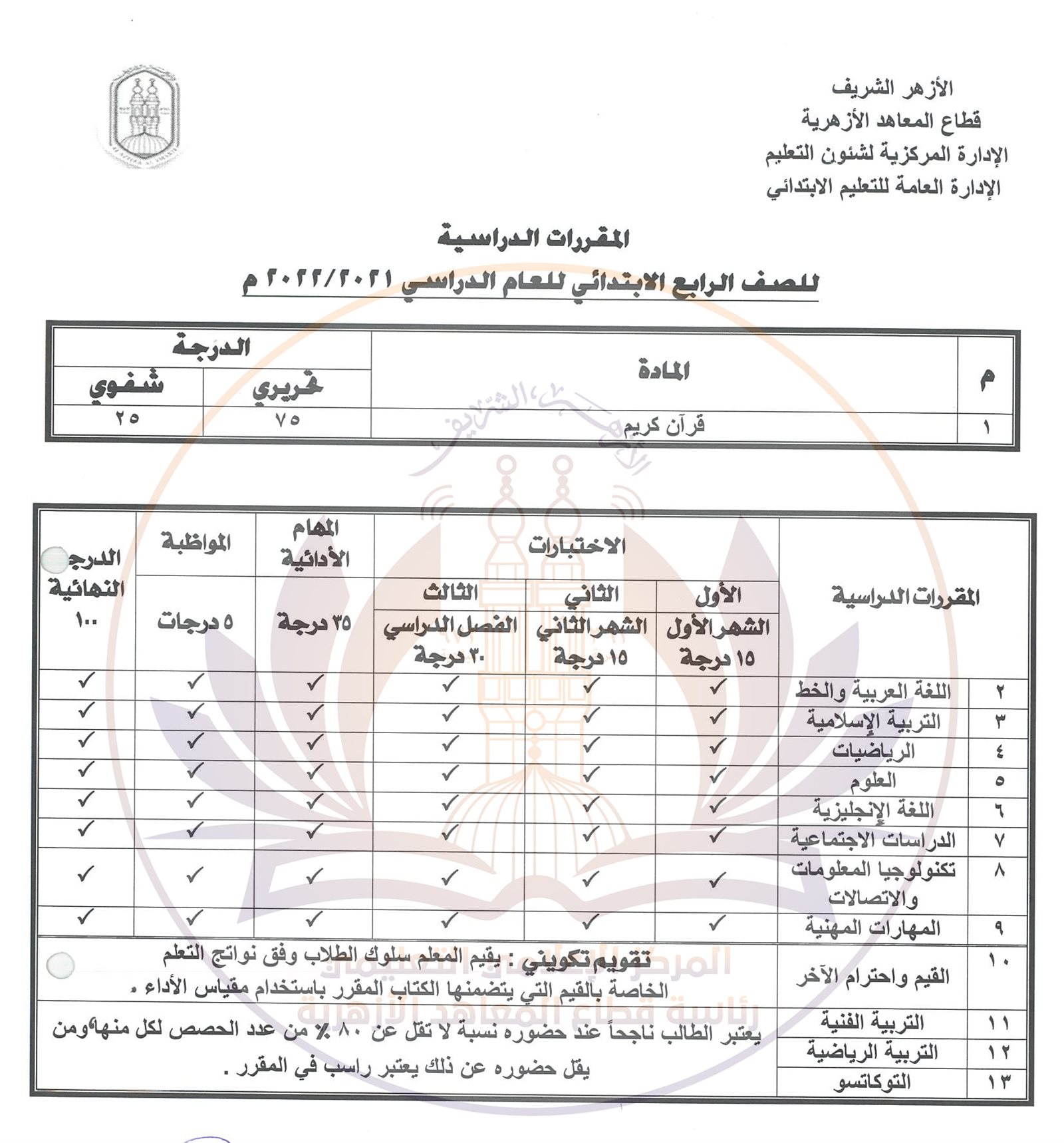 وقال قطاع المعاهد الأزهرية، إن المقررات الدراسية الأساسية هي: القرآن الكريم، التربية الإسلامية، اللغة العربية والخط والرياضيات واللغة الإنجليزية والعلوم والدراسات الاجتماعية والمهارات المهنية وتكنولوجيا المعلومات.