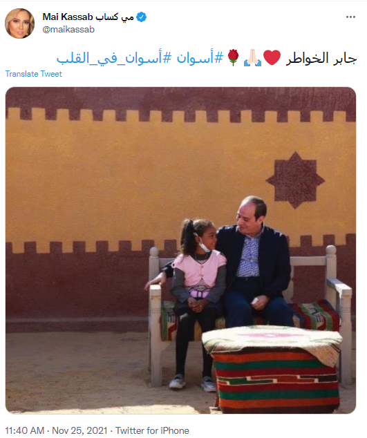ونشرت الفنانة مي كساب صورة للرئيس عبد الفتاح السيسي بجانب طفلة من أسوان صغيرة، معلقةً عليها: جابر الخواطر.. أسوان في القلب.