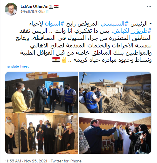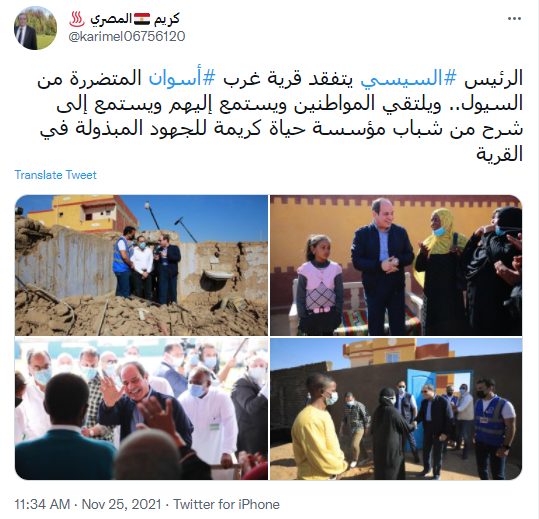 ونشر حساب باسم كريم المصري مجموعة صور للرئيس السيسي بصحبة أهالي أسوان، معلقًا عليها: الرئيس السيسي يتفقد قرية غرب أسوان المتضررة من السيول.. ويلتقي المواطنين ويستمع إليهم ويستمع إلى شرح من شباب مؤسسة حياة كريمة للجهود المبذولة في القرية.