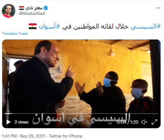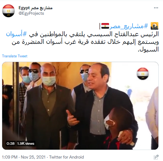 ونشر حساب آخر فيديو للرئيس، وكتب عليه: مشاريع مصر، الرئيس عبد الفتاح السيسي يلتقي بالمواطنين في أسوان ويستمع إليهم خلال تفقده قرية غرب أسوان المتضررة من السيول.