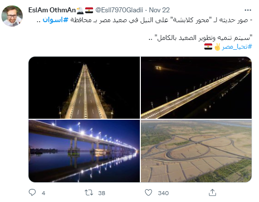 وكتب حساب آخر: صور حديثة لـ محور كلابشة على النيل في صعيد مصر بـ محافظة أسوان، وسيتم تنمية وتطوير الصعيد بالكامل.