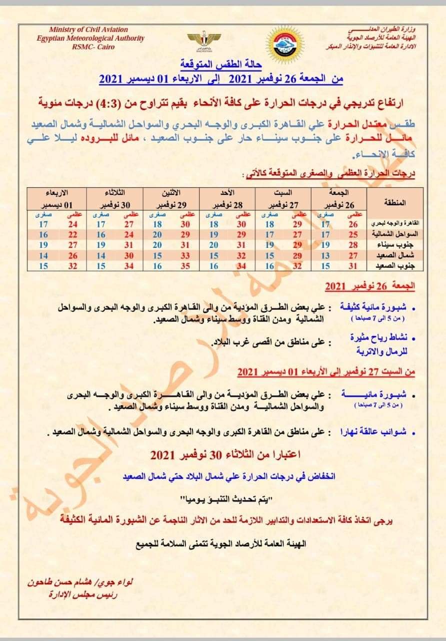 أصدرت الهيئة العامة للأرصاد الجوية، النشرة الجوية الخاصة بتنبؤات حالة الطقس في مصر، خلال أسبوع مقبل، بدءًا من غد الجمعة وحتى الأربعاء المقبل الموافق 1 ديسمبر 2021.
