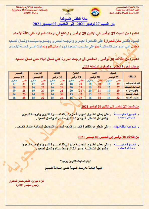 وأوضحت الهيئة العامة للأرصاد الجوية، أنه يسود خلال تلك الفترة طقس مائل للحرارة على القاهرة الكبرى والوجه البحري وجنوب سيناء وشمال الصعيد، معتدل على السواحـل الشمالية، حار على جنوب الصعيد نهارا، مائل للبرودة ليلًا على كافـــة الأنحاء.