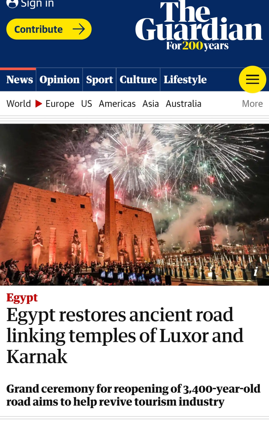 كما نقلت صحيفة الجارديان الأمريكية صورا ولقطات من حفل الافتتاح أمس، مسلطة الضوء على أهمية ربط معبد الأقصر بمعبد الكرنك على إحياء السياحة في الأقصر التي تحتوي وحدها على ثلثي أثار العالم.