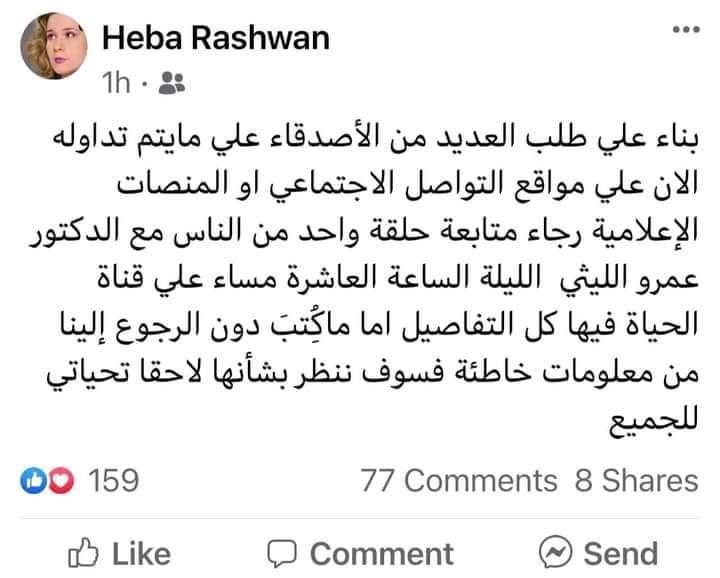 ونشرت ابنة رشوان توفيق عبر صفحتها الخاصة على فيس بوك: بناءً على طلب العديد من الأصدقاء بشأن ما يتم تداوله الآن، على مواقع التواصل الاجتماعي، أو المنصات الإعلامية، رجاء متابعة حلقة واحد من الناس، مع الدكتور عمرو الليثي، الليلة الساعة العاشرة مساء، على قناة الحياة.