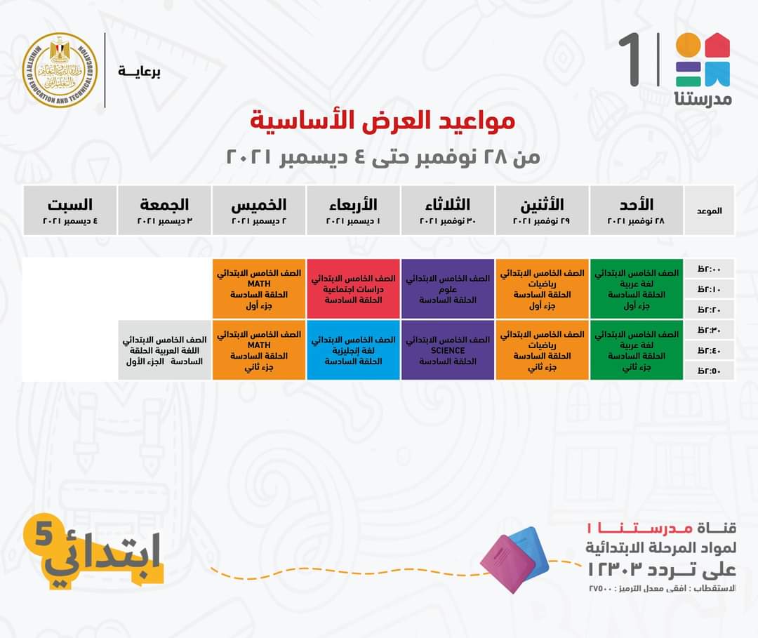 ونشرت قناة مدرستنا عبر صفحتها الرسمية على موقع التواصل الاجتماعي، جدول الصف الخامس الابتدائي بتاريخ 28 نوفمبر إلى 5 يسمبر لمتابعة الدروس على التردد 12303 أفقي.