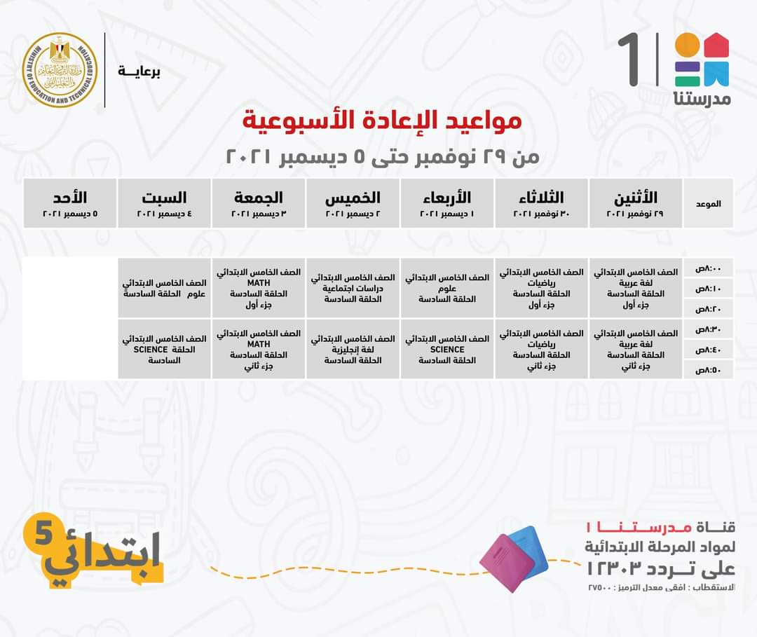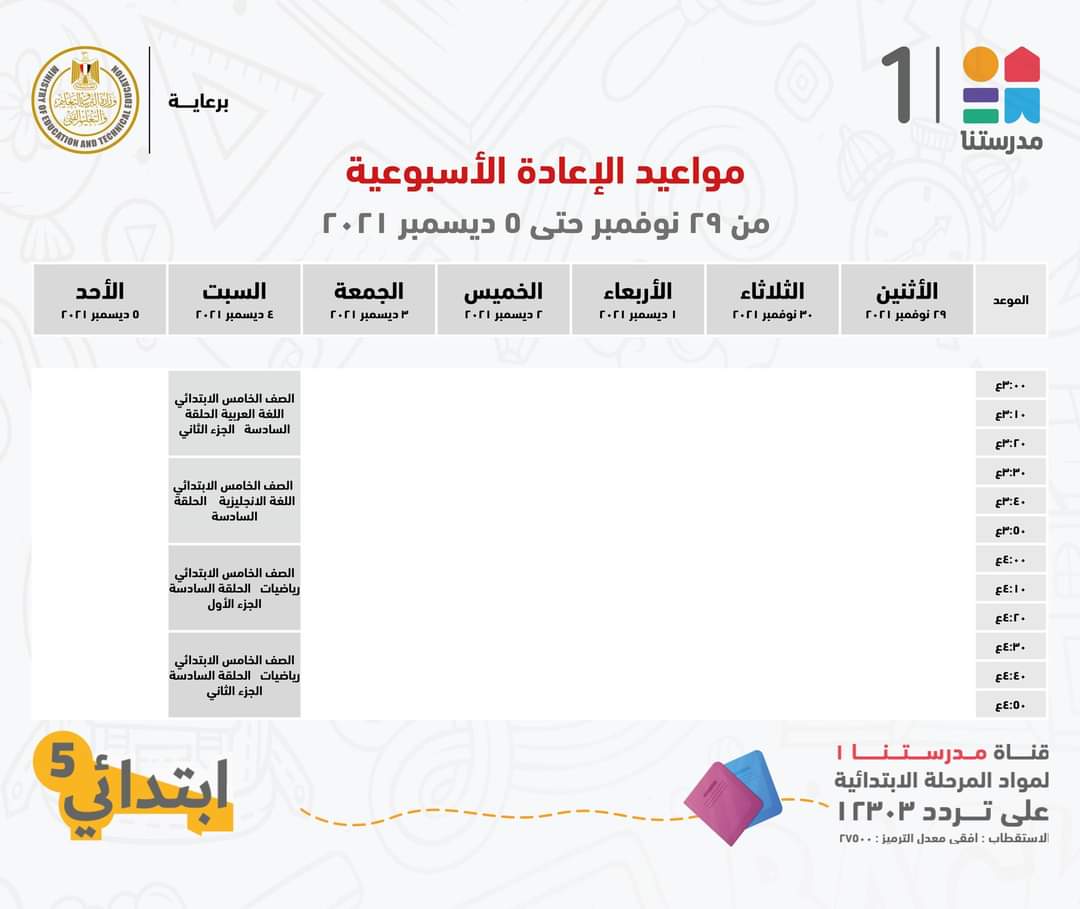 أعلنت قناة مدرستنا 1، التابعة لوزارة التربية والتعليم، للطلاب وأولياء الأمور، الجدول الخاص بالصف الخامس الابتدائي، مع مواعيد عرض الإعادة الأسبوعية.