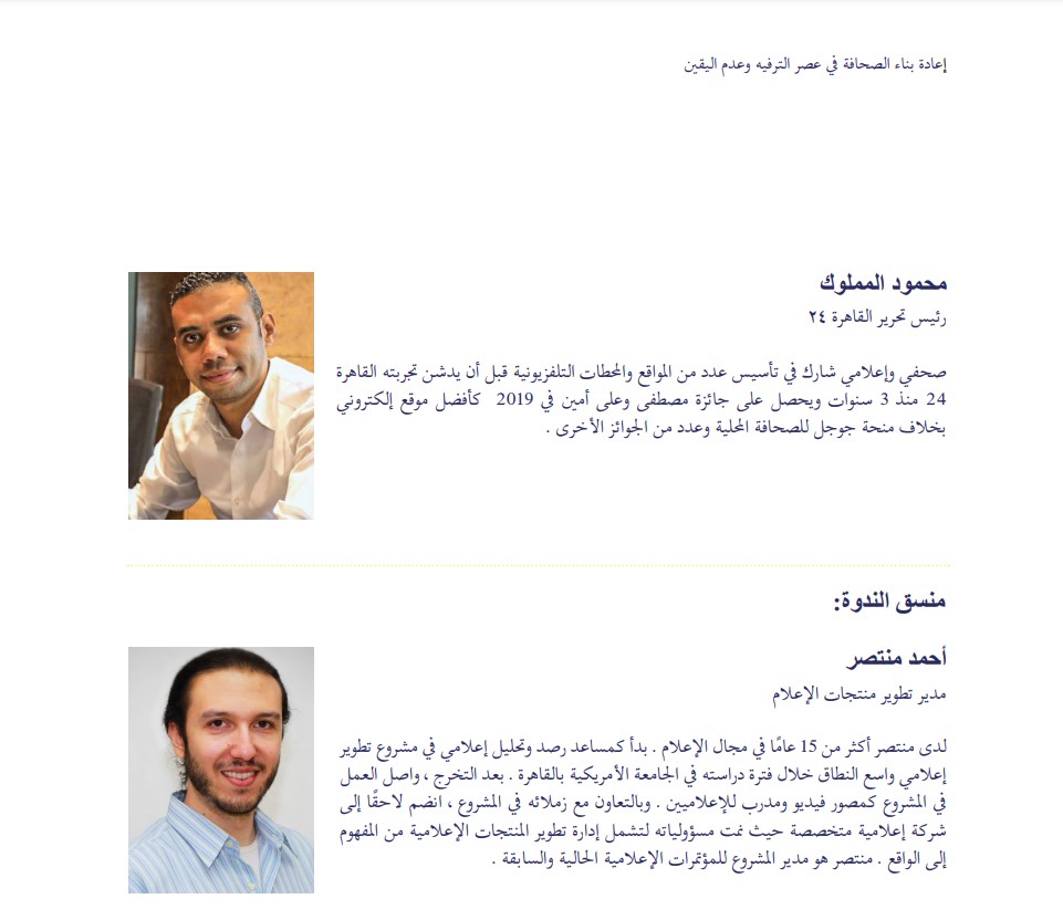 كما يشارك في المؤتمر عدد من الصحفيين الدوليين، من دولة النرويج منهم هيلديجن سولدل رئيس القسم الرقمي بهيئة الإذاعة والتلفزيون النرويجية وكريستوفر إيجبيرج رئيس تحرير موقع التحقق من الحقائق بالنرويج وترأس المؤتمر الدكتورة نائلة حمدي العميد المساعد للدراسات العليا والبحوث بالجامعة الأمريكية بالقاهرة، وهى أكاديمية وباحثة في مجال الصحافة وتعمل أستاذا مشاركا في الصحافة والاتصال الدولي، حيث تقوم بالتدريس في قسم الصحافة والاتصال الجماهيري لمدة تزيد عن 20 عاما.