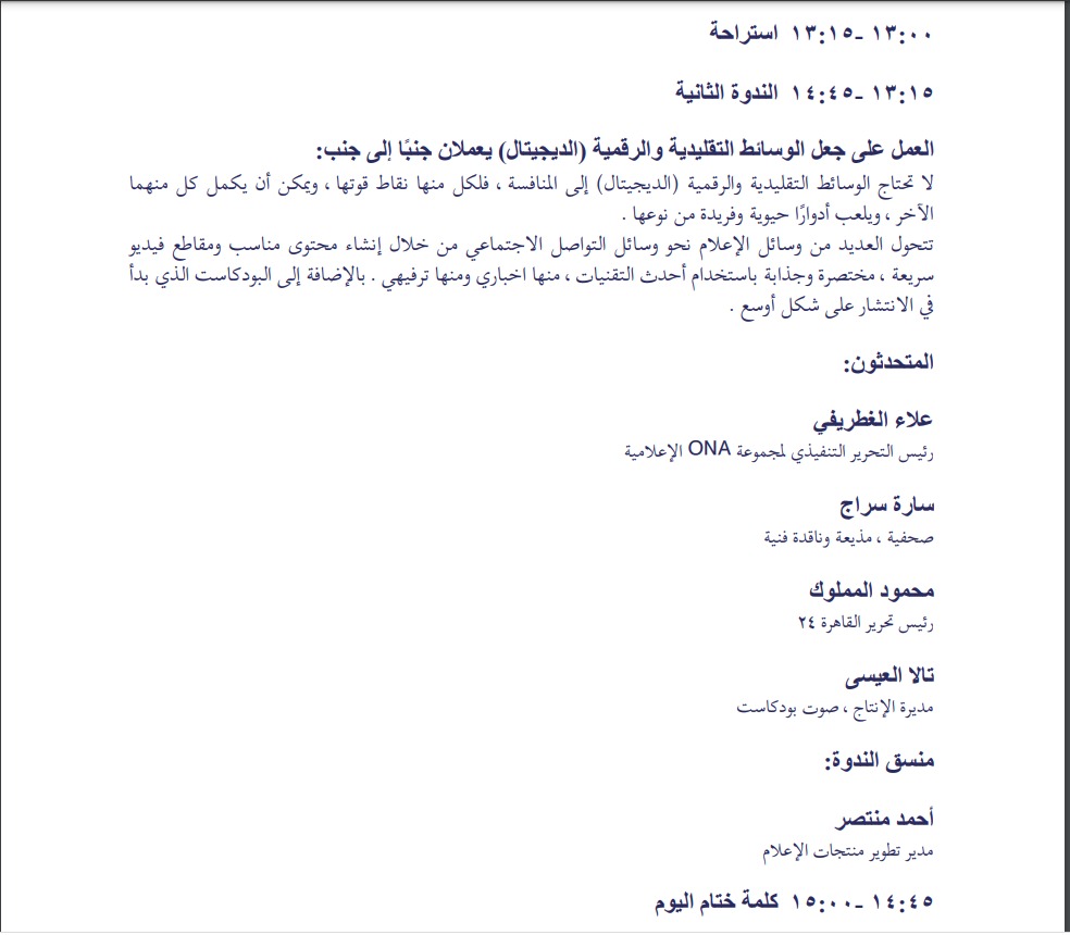 كما يشارك في ذات الندوة الكاتب الصحفي علاء الغطريفي، رئيس التحرير التنفيذي لمجموعة ONA الإعلامية، وسارة سراج صحفية ومذيعة، وتالا العيسى مدير الإنتاج بصوت بودكاست، وأحمد منتصر مدير تطوير منتجات الإعلام والمنسق العام للمؤتمر.